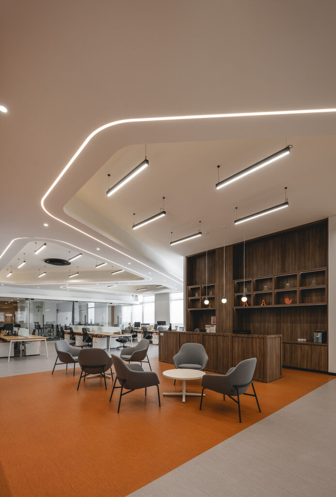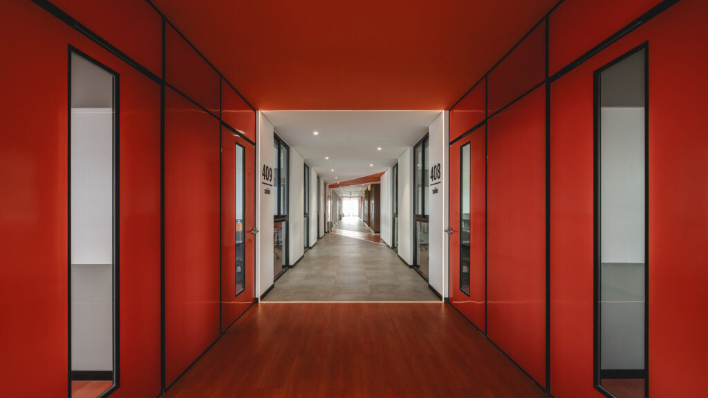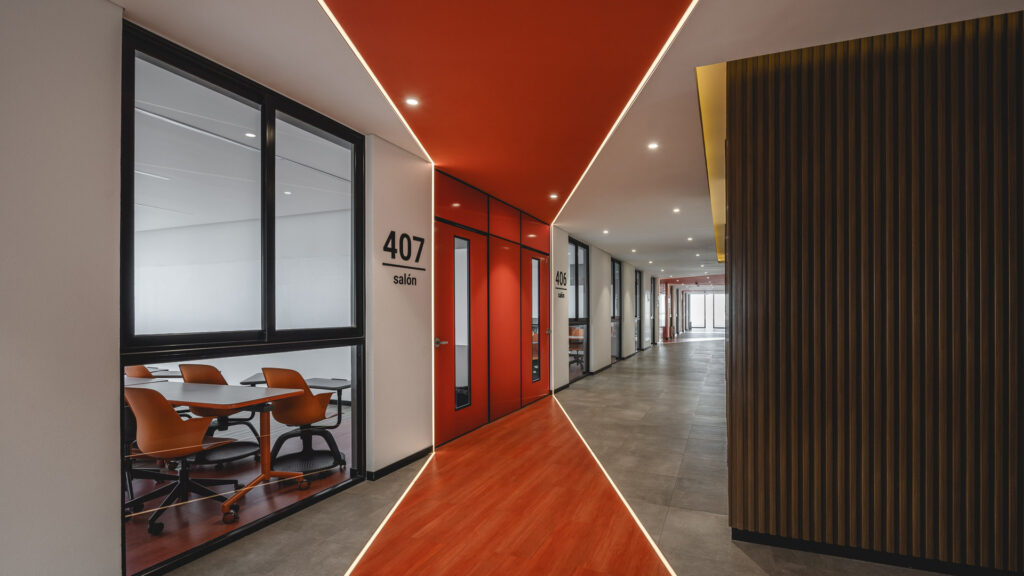 Uno de los recursos más representativos del proyecto es el tratamiento de las circulaciones interiores, que se convierten en el hilo conductor del diseño. Franjas continuas de color naranja recorren pisos, muros y plafones, acompañadas por iluminación integrada que subraya su trazo. Este gesto transforma largos pasillos en recorridos activos, rompe la monotonía, jerarquiza accesos y convierte el tránsito en una experiencia de orientación, encuentro y pausa.