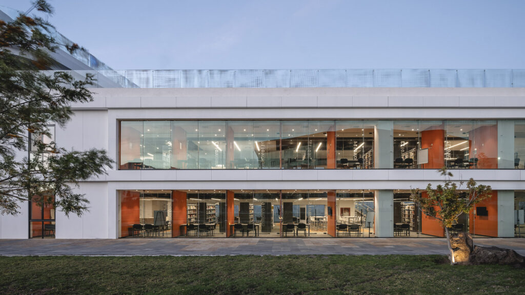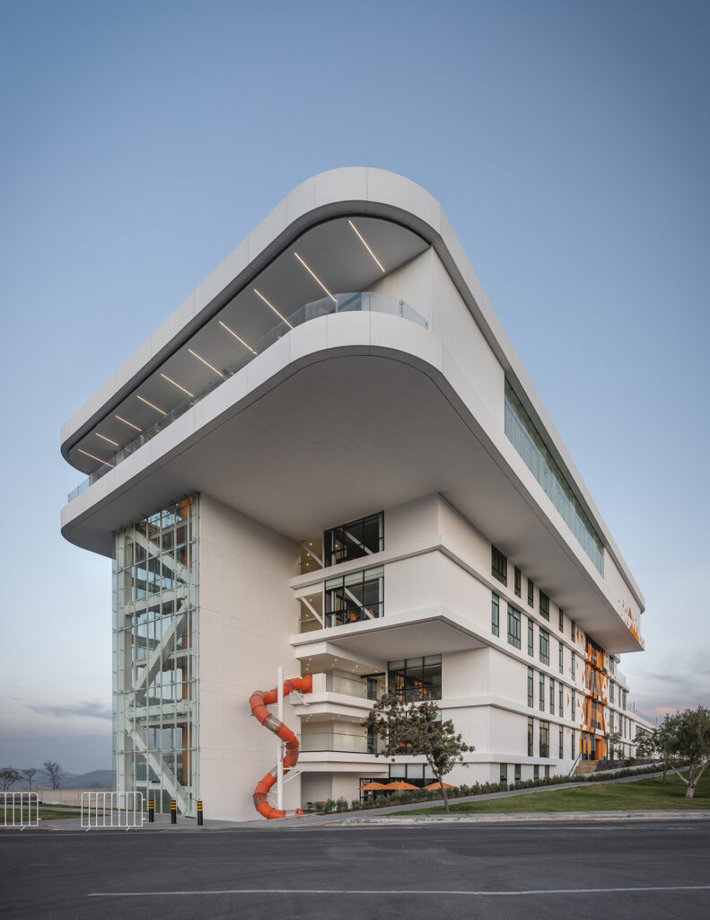 El programa interior contempla salones de clase, aulas tipo Lecture Hall, circulaciones, baños, una biblioteca, oficinas administrativas, salones de negocios, aula magna, sala de consejo, área de catering, comedor de directivos, salón ejecutivo, terrazas exteriores y un elemento distintivo: un tobogán que introduce un contrapunto lúdico dentro del conjunto, recordando que la innovación también se construye desde la sorpresa y el juego.